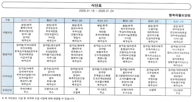 2026년 1월 3주 식단표 페이지 정보 작성자 관리자 댓글 0건 조회 12회 작성일 26-01-16 19:09 목록 본문 2026년 1월 3주 식단표 이전글2026년 1월 4주/2월 1주 식단표 26.01.23 다음글2026년 1월 2주 식단표 26.01.04 댓글 0 댓글목록 등록된 댓글이 없습니다.